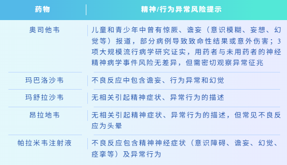 浙大二院药剂科副主任、主任药师周权和副主任药师俞凌燕先容,使用抗流感药物时,需原谅潜在的精神/步履特殊风险,不同药物的安全领导如下。