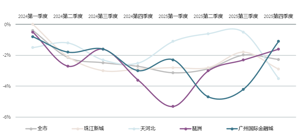 广州甲级办公楼市集房钱趋势(2025年) 注:房钱环比变化率基于同质可比样本 受访者 供图